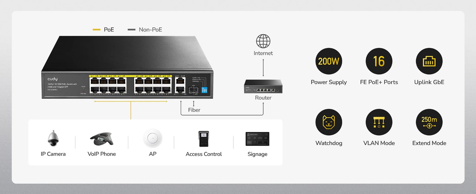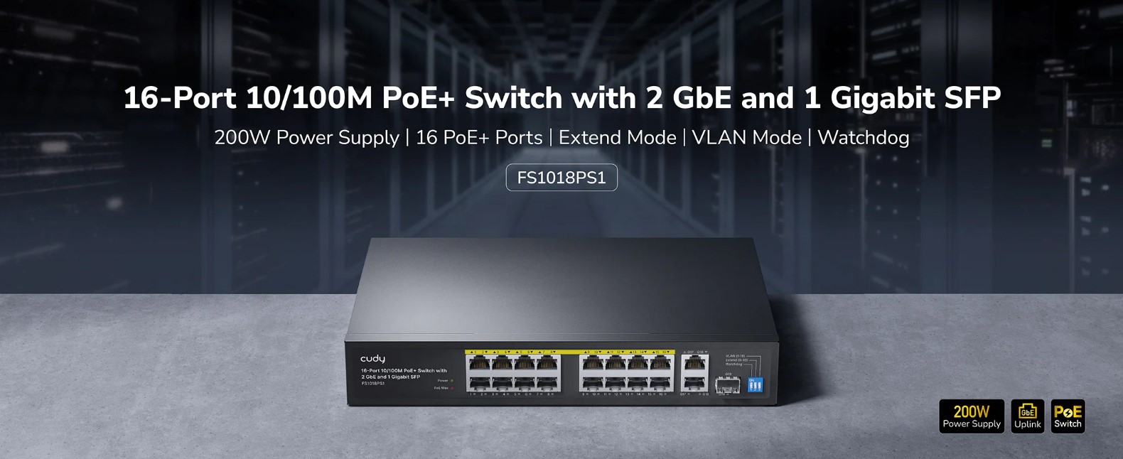CUDY FS1018PS1 PoE+ Switch 16-Port 10/100M with 2 Uplink GbE and 1 Uplink SFP Slot / NEW / พร้อมส่ง