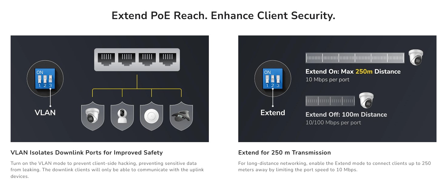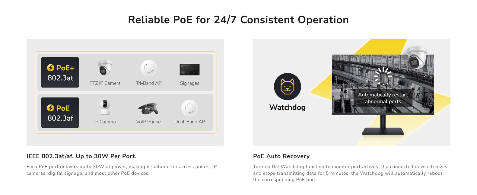 - สวิตช์ PoE 18 พอร์ตที่ติดตั้งในชั้นวางพร้อมแหล่งจ่ายไฟ 200W และระบบระบายความร้อนแบบเงียบ พร้อมสวิตช์ควบคุมอิสระสำหรับคุณสมบัติ Extended, VLAN, Watchdog